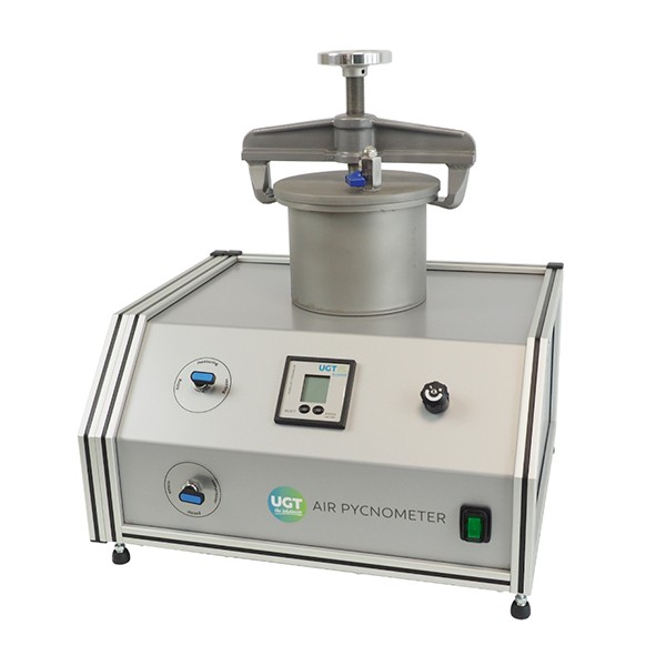 儀器由外置樣品室、與樣品室相聯(lián)通的內(nèi)置壓力室及數(shù)字氣壓計等組成。測量前需要先對壓力室的體積和樣品室的體積(盛放土壤樣品的容器如取樣環(huán)等必須放入樣品室內(nèi))進行校準(zhǔn):先測量壓力室與樣品室聯(lián)通平衡前后的壓力變化,再將已知體積的校準(zhǔn)塊(可用已知體積的砝碼等)放人樣品室重新測量壓力室與樣品室聯(lián)通平衡前后的壓力變化,即可完成對壓力室和樣品室體積的校準(zhǔn)。土壤樣品經(jīng)干燥稱重后(如此可以得出土壤含水量)放入樣品室,打開壓力室與樣品室聯(lián)通閥,測量氣體平衡前后的壓力變化。最終通過所附的Excell文檔,即可得出土壤空隙度、pF等于1.8時的土壤空隙或田間持水量、土壤飽和持水量等,而且可以根據(jù)下面公式得出土壤三相比: