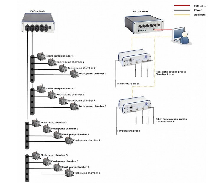 該系統(tǒng)基于光纖傳感技術(shù),由軟件和硬件設(shè)備組成,能在八個(gè)任意大小、形狀、體積的呼吸室里自動(dòng)測(cè)量動(dòng)物對(duì)氧的消耗率。還可兼容測(cè)量水溫的設(shè)備以及實(shí)時(shí)補(bǔ)償氧氣值軟件。需要針對(duì)實(shí)驗(yàn)動(dòng)物對(duì)象配備合適的試驗(yàn)呼吸室chambers,以及匹配的8個(gè)光纖袖珍氧氣傳感器。
